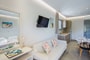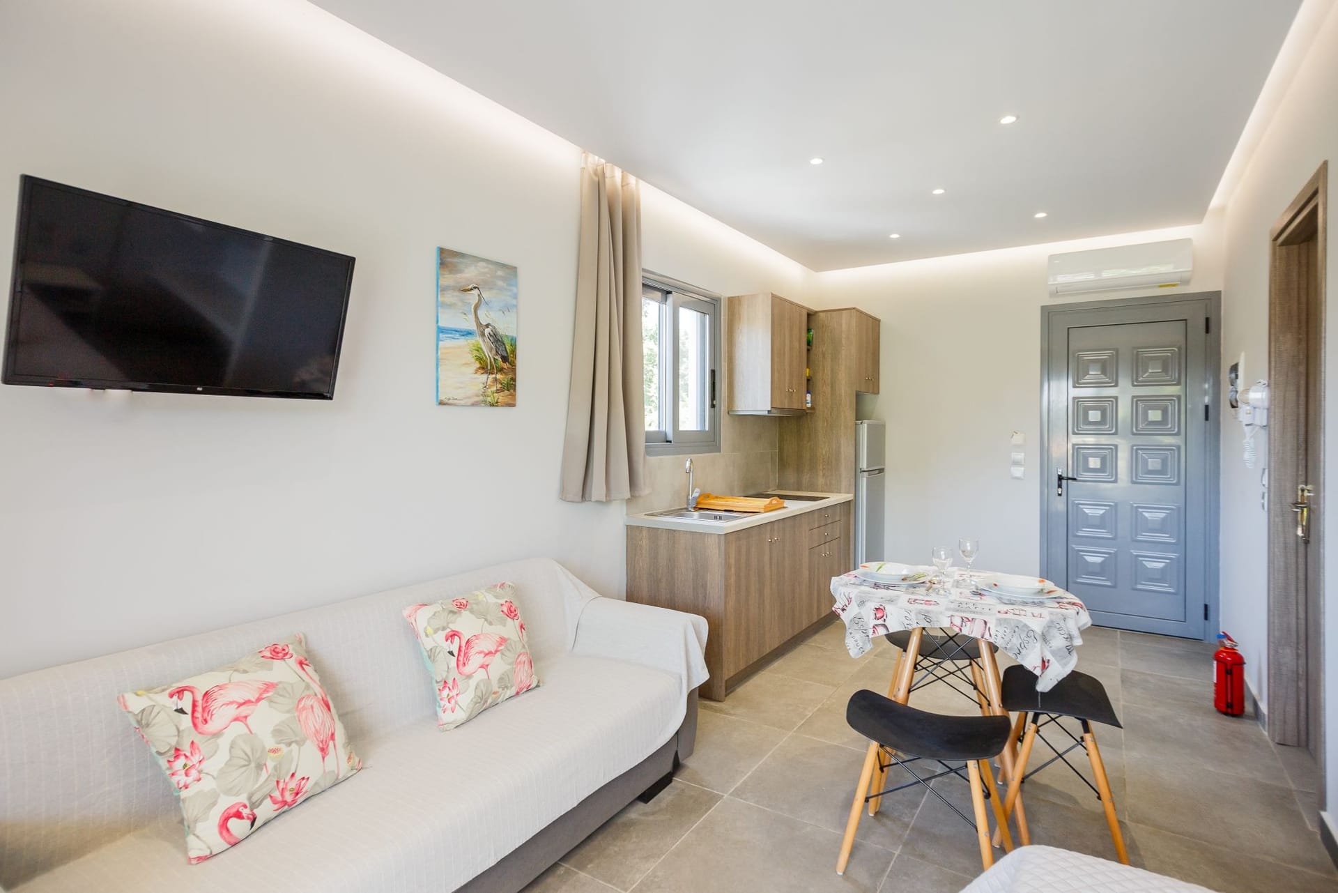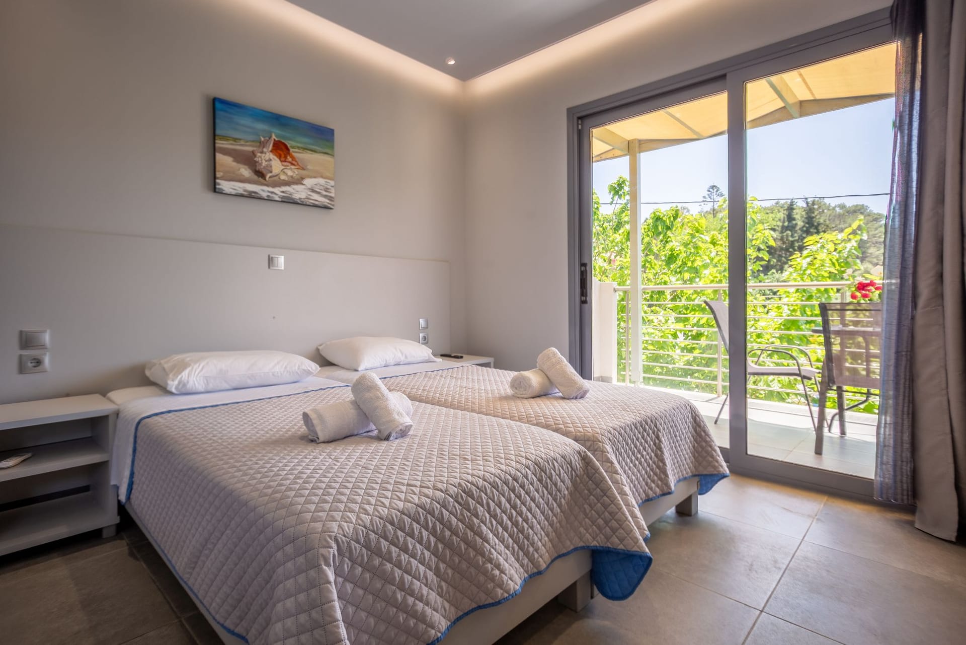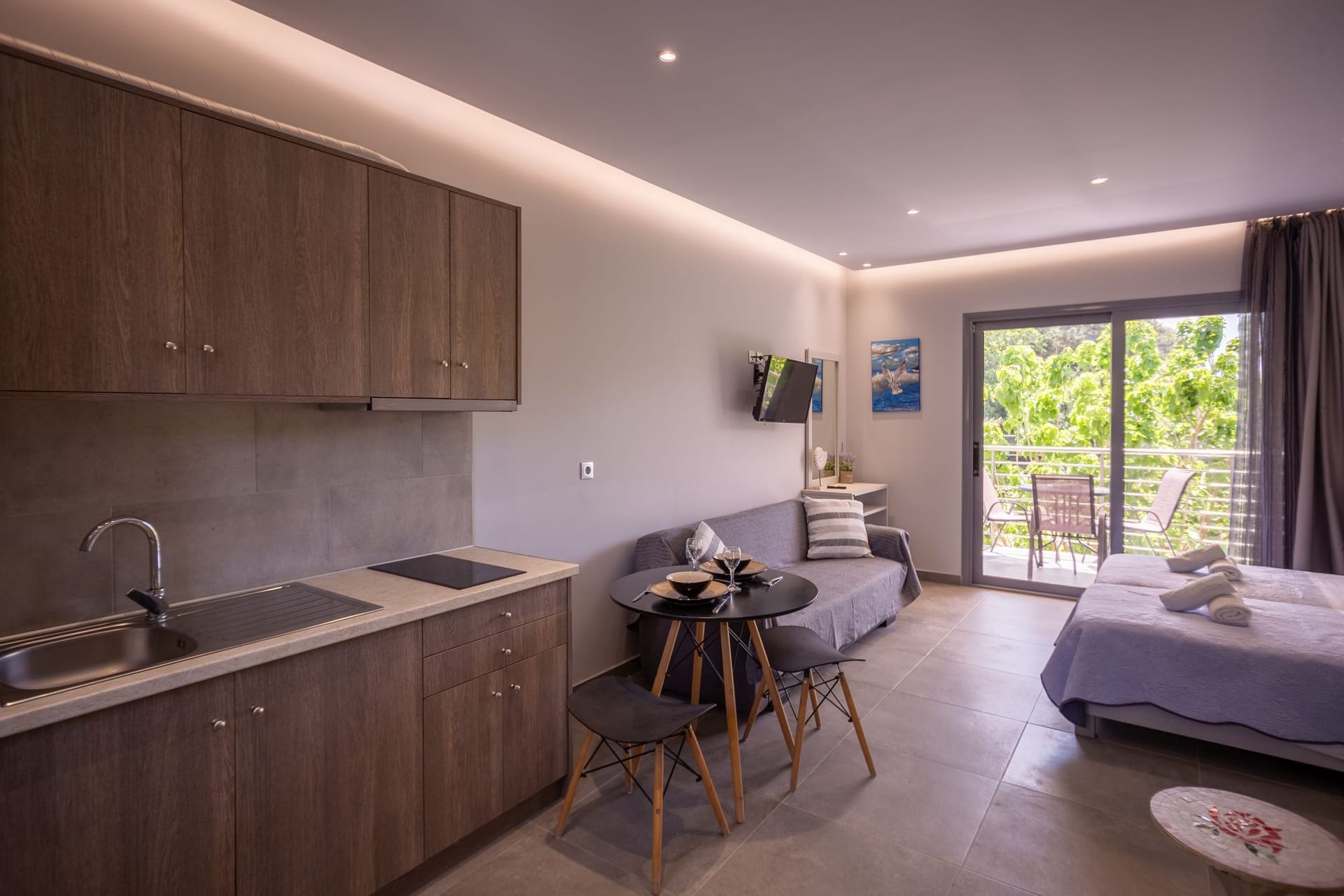 The studio is capable of accommodating up to 3 guests. In an interior space of 30 sq. m., it includes an open bedroom area with two single beds that can be combined into a double and a single sofa bed. There is also a bathroom with shower and a kitchenette at the guests’ disposal. Located on the first floor, it offers a garden view.